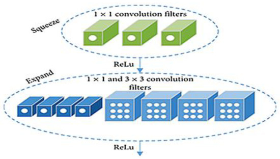 The squeezing and extension processes both utilize the ReLU units. While maintaining the exact size of the features, the squeeze operation compresses the depth, and the expansion increases the depth. In the input tensor’s depth dimension, the expansion outputs are layered using the concatenate action. Assume the channels and feature maps are defined by C and FM. The squeeze operation’s output layer f{y}, w can be represented as with the kernel, i.e.: