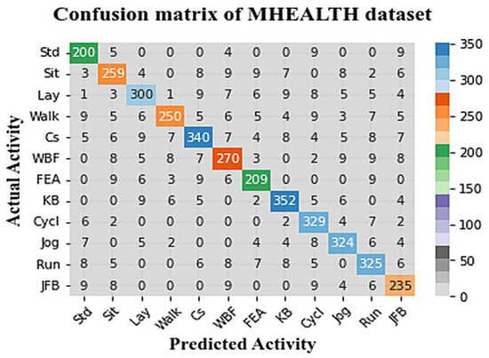 The confusion matrix values are used for assessing the proposed work’s performance for each class. These values are evaluated using the following metrics: accuracy, sensitivity, and specificity. Figure 5 demonstrates the confusion matrices of HAR classification using MHEALTH.