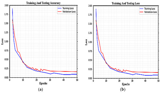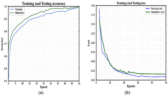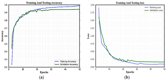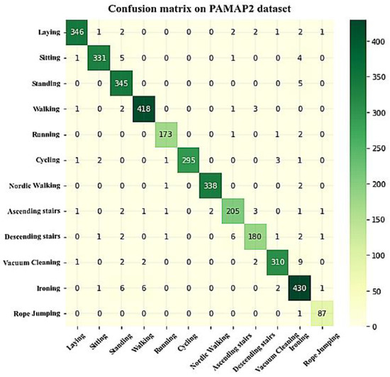 The training and validation accuracy and loss curve of the proposed model on PAMAP2 under 50 epochs are shown in Figure 12a,b. After 20 epochs, each curve’s fluctuation is minimal, and the accuracy rises with the number of epochs. The proposed model reaches an overall accuracy of 99.54%. For 12 involved activities, the average F1-score, recall, and precision in the PAMPA2 dataset are 99.27%, 99.21%, and 99.02%, respectively.