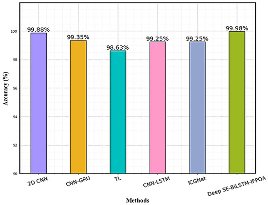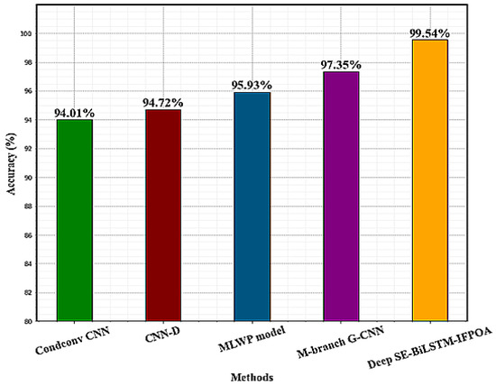 The comparison results of the proposed model with prior deep learning research are given in Table 8. CNN-D was developed by Jin et al. [35], the combination of LSTM, CNN, and MLP, and the developed CNN-D model reveals higher effectiveness for HAR. The proposed model’s accuracy improves by 4.82% when compared to CNN-D. The accuracy rises by 1.92% compared to [24], which used Condconv for the basic convolution layer. Zhou et al. [36] utilize the MLWP model for the HAR process. According to the properties of static activity signals with minor fluctuations in this MLWP process, slope-area (SA) and threshold segmentation (TS) techniques are used, and it achieved an accuracy of 95.93%. M-branch G-CNN is proposed by Li et al. [37], the most important features are selected by introducing a dual attention mechanism that combines spatial attention and channel attention, and it achieves an accuracy of 97.35. Feng et al. [38] proposed a CNN-Bi-LSTM model to detect the real-time building occupancy from publicly available AMI data with 90% occupancy detection accuracy. The proposed network model’s accuracy is also considerably higher than those of existing HAR techniques. The PAMAP2 dataset shows that the proposed model is the most accurate, with a 99.54 accuracy rate from Table 8. Effective classification results are maintained by the proposed Deep SE-BiLSTM-IFPOA model with less computational power in conclusion. The performance comparison graph on the PAMPA2 dataset is given in Figure 13.