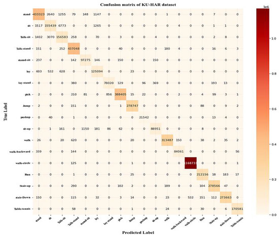 The proposed model’s confusion matrix for the KU-HAR dataset.