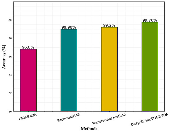 The comparison results of the proposed model with existing HAR research on the KU-HAR dataset are given in Table 7. Dahou et al. [33] utilize CNN-BAOA for the HAR process, the CNN model is used for significant feature extraction, and BAOA is used for selecting the most relevant features of activities. It achieves an accuracy of 96.8%. Kumar et al. [34] provide a Recurrent HAR model for HAR, reaching an overall accuracy of 98.98%. This method classifies skin cancer as benign or malignant. Luptáková et al. [22] also achieved an accuracy of 99.2% for HAR classification using the transformer method. While compared to the prior deep learning models, the proposed Deep SE-BiLSTM-IFPOA classification model achieves higher classification accuracy and effectively recognizes human activities. Figure 10 shows the performance comparison on the KU-HAR dataset.