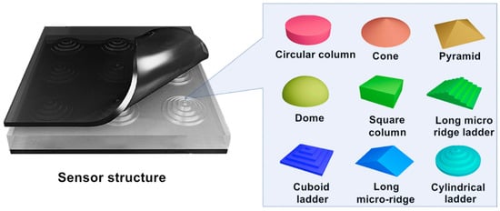 The surface microstructure of the sensor can improve its sensitivity, because during the compression process, air is squeezed out from the microstructure, leading to an increase in the proportion of the middle dielectric layer in the overall middle layer. This results in an increase in the equivalent dielectric constant εr2/εr1 of the middle layer, which, in turn, increases the sensitivity of the sensor. Secondly, for basic surface microstructures such as circular columns, cones, pyramids, domes, square columns, and long micro-ridges, under the same compressive stress, the greater the compressive displacement, the smaller the distance between the electrodes, and the higher the sensitivity. Among them, cones, pyramids, and long micro-ridges have smaller contact areas during the compression process, leading to stress concentration at the tips, resulting in larger mechanical deformation, smaller electrode distances, and higher sensitivity. Furthermore, ladder-shaped microstructures, such as long micro-ridge ladders, cuboid ladder structures, and cylindrical ladder structures, have further improved compressibility. As a result, the sensitivity of these ladder structures is higher than that of the corresponding basic structures.