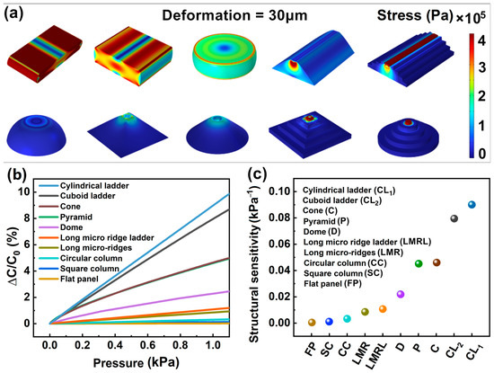 Simulation results of (a) Stress and stress distribution diagram of different microstructures under 30 μm strain; (b) Capacitance change rate of different microstructures under stress change; (c) Structural sensitivity of different microstructures.