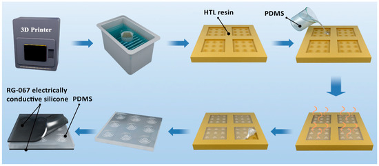 In order to verify the reliability of the simulation and study the influence of mold surface microstructures on flexible capacitive pressure sensors, we fabricated molds with the above nine microstructures by 3D printing technology. Subsequently, we produced the corresponding dielectric layer structures with microstructures by casting molds. This allowed us to prepare a prototype of a flexible capacitive pressure sensor. The preparation process is shown in Figure 3.