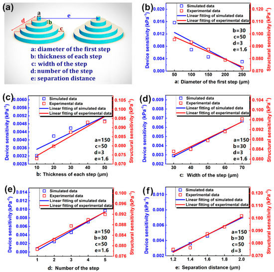 The sensitivity of the sensing performance was studied by using the control variable method to investigate the effects of the 5 intrinsic dimensions of cylindrical ladder microstructures. Both simulation and experimental tests (seen in Figure 4b–f) have been carried out.