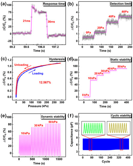 In order to verify its detection limit and resolution, pressures of 20 Pa, 40 Pa, and 60 Pa were, respectively, applied to the sensor. As shown in Figure 5b, when the above pressures are applied sequentially, the capacitance change rate shows a stepwise increase.