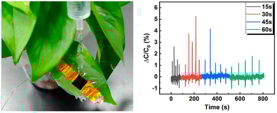 To evaluate the sensing capability of our flexible pressure capacitive sensor in practical applications, we have attached the sensor to the surface of a plant leaf and used a liquid gun to simulate rainfall. The experiment was conducted with droplets falling at intervals of 15, 30, 45, and 60 s, as shown in Figure 6. The results of the experiment demonstrate that our flexible pressure capacitive sensor has a fast response time to the interval between droplets. The sensor capacitance quickly returns to its initial value as the droplet flows down the sensor surface, indicating the high sensitivity and stability of the sensor.