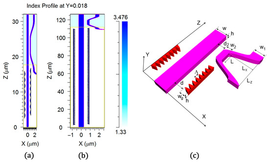 General design of the bimodal grating sensor element with the built-in mode filter based on the directional coupler. (a) Index profile cut for the small grating length (view with aspect ratio 1:1); (b) Index profile cut for the moderate grating length (view with aspect ratio 10:1); (c) 3D drawing of the device (aspect ratio 10:1) for the small grating length with the relevant optimized parameters: w = 0.58 µm, h = 0.22 µm m, w1 = 0.45 µm, w2 = 0.26 µm, d = 0.25–0.46 µm, wg = 0.20 µm, d2 = 0.36 µm, ∧ = 1.63–1.65 µm, L = 4 µm, Lx = 1.1 µm, Lz = 14 µm.