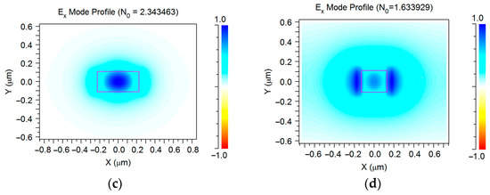 This structure, built on SOI, supported the optical modes with the main profile distribution obtained by Finite Element Method (FEM), which is shown in Figure 2. The simulations were accomplished by the commercial software FemSIM by Rsoft/Synopsis [55]. Note that the TE1 mode had a much stronger penetration depth into the environment than that of the TE0, which provided higher dependence of an effective mode index Ni on the environment index nc. For example, we have collected the following data that are typical of the suspended silicon waveguide, as well as the fundamental and first modes that are not far from and close to a cutoff condition, respectively, ∂N0/∂nc = 0.185 and ∂N1/∂nc = 0.887. Thus, the bimodal sensor would provide high volume sensitivity (see (1)) for all optical wavelengths in the vicinity of a dispersion turning point, where N0g = N1g.