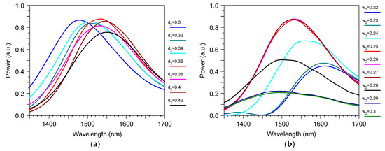 The wavelength spectrum of the transmitted power through the mode filter based on the directional coupler: (a) as a function of the directional coupler gap d2 (μm); (b) as a function of the minimum waveguide width w2 (μm) of the right arm of the directional coupler. Input is the TE1 mode in the left branch of the waveguide and Output is the TE0 mode in the right branch of the waveguide. Simulation by 3D FDTD.