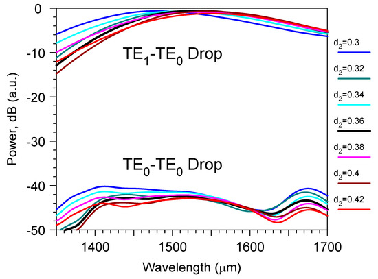 The wavelength spectrum (on the dB scale) of the transmitted power through the mode filter based on the directional coupler for different gaps d2 (μm) of the directional coupler. Inputs are the TE0 or TE1 modes in the left branch of the waveguide and Output is the TE0 mode in the right branch of the waveguide Simulation by 3D FDTD.