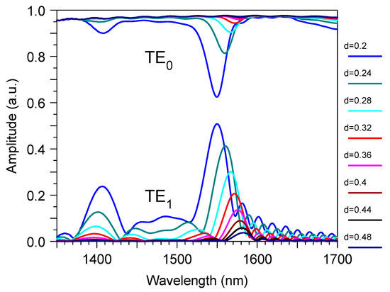 The wavelength spectrum for the amplitude of the transmitted power through the bimodal grating sensor element for the different spacing d (μm) between the waveguide and grating. Simulation by 3D FDTD.