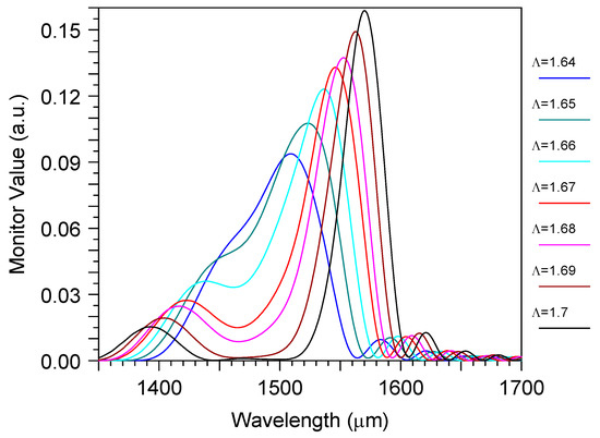 The wavelength spectrum of the transmitted power through the bimodal grating sensor element for the different grating periods ∧ (μm). Simulation by 3D FDTD.