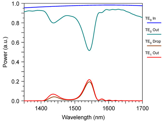 As it was mentioned before, our design incorporated both the grating sensor element and the mode demultiplexer. The typical signals that can be measured by OSA for this device are shown in Figure 7. According to the traditional design, one can measure the power “TE0 Out” at the end of the bimodal waveguide. According to our approach, it is better to measure the power “TE1 Drop” at the demultiplexer output. It is important that, for the proper design, this signal will be slightly (only by −0.5 dB) smaller than the optical power “TE1 Out” that is determined just at the end of the grating sensing element.