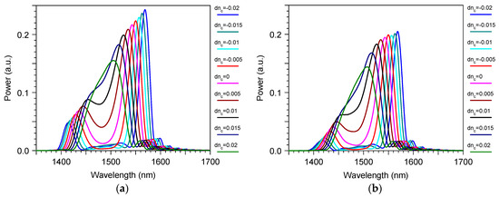The wavelength spectrum for a different index increment in water for the transmitted power through the bimodal grating sensor element with the mode filter based on the directional coupler: (a) “TE1 out” for the power at the output of the grating section; (b) “TE0 Drop” for the power at the output of the directional coupler demultiplexer. Simulation by 3D FDTD.