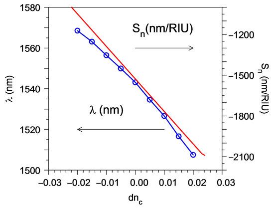 Note that it is possible to keep the same iLOD with a much larger sensitivity value by decreasing the period and by choosing the wavelength drop to be closer to the dispersion tuning point, but this will provide a higher inhomogeneous dependence of the sensitivity and, thus, the smaller operation range in the change of the liquid index that is measured by the sensor. For example, in the case that the sensor demonstrates a sensitivity of around 1770 nm/RIU, which varies at the range ± 240 nm/RIU for the index perturbation from 0 to 0.02 RIU (Figure 9).