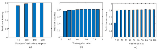 Prediction accuracy of the parameter versus (a) the number of realizations per point, (b) the training data ratio, and (c) the number of AAH bins. The signal is 8-PAM with a 10 Gbaud transmission speed and OSNR = 10 dB.