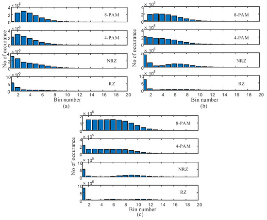 Figure 3 shows the AAH features for the four modulation format signals under different values of channel turbulence that cover weak to strong turbulence. It is clear that the AAH features are somewhat different for each modulation format (under the same impairment or different values for turbulence). For example, in Figure 3a, the 4-PAM signal has a different AAH feature than the three other modulation formats. In addition, the AAH feature of the 4-PAM signal is different under the three different turbulence conditions, as shown in Figure 3a–c. Therefore, the AAH feature is a powerful tool in this work that will simplify building the autonomous FSO system. The amount of correlation between the different AAH features will determine the accuracy of the ML model.