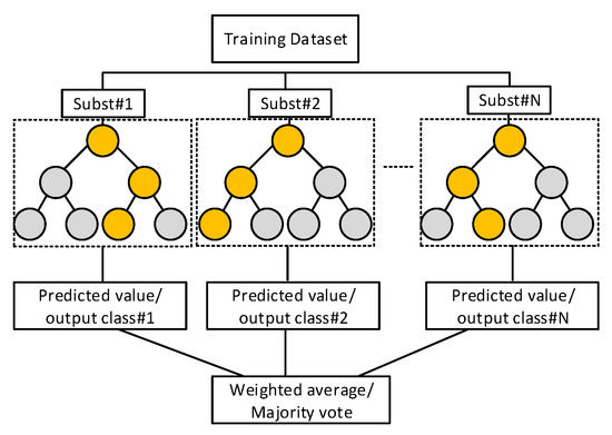 In this work, we consider the random forest (RF) ensemble algorithm for both modulation format/baud rate classification and impairment regression. Its principle is based on building a number of independent decision trees (DTs) during the training phase; each one is trained individually by selecting a random subset from the whole training dataset. This randomness ensures having DTs that are independently trained [10,25]. The randomness training ensures that if some DTs would produce less accurate results, many could produce more accurate results. Hence, instead of using a single DT, ensemble learning that uses a group of DTs ensures stable results with better classification/prediction accuracy [26,27]. After training, the predictions from all individual DTs will be averaged in the case of prediction RF. For classification, a majority vote is taken, where the class with the maximum number of votes is selected. Figure 4 illustrates the conceptual framework of the RF ensemble algorithm that includes N DTs.