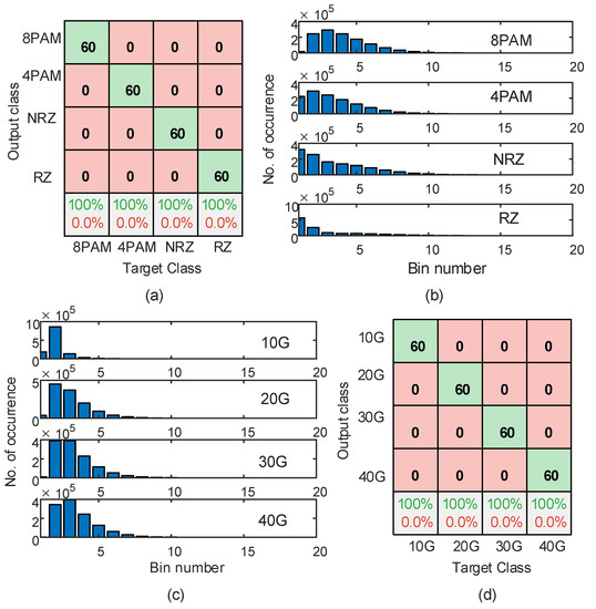 The RF modulation format classifier is used to classify the four modulation formats, which are NRZ, RZ, 4-PAM, and 8-PAM, under different system conditions. The confusion matrix that is shown in Figure 5a is used to illustrate the accuracy of the modulation format classification by comparing the target class with the model’s output class. The diagonal cells show the number of correctly identified modulation formats among the total number in the test data, i.e., among the 60 realizations used for model testing for each parameter. The off-diagonal cells show the number of misclassified modulation formats. The last row shows the accuracy percentage of predicting the modulation format (top green) and the percentage of misclassifying it (bottom red).