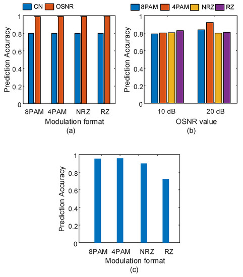 Next, we study the case of predicting the turbulence parameter when the signal is also corrupted by certain values of ASE noise. Two different values are considered for the OSNR parameter: 10 and 20 dB. The results in Figure 6b show that the prediction accuracy improves with 8-PAM and 4-PAM modulation formats when the OSNR value improves from 10 to 20 dB. For NRZ and RZ modulation format signals, the prediction accuracy almost shows no improvement. The minimum prediction accuracy is 79%, and the best-achieved accuracy is 92%. In Figure 6c, we illustrate the prediction accuracy of the OSNR parameter when the signal is corrupted by severe turbulence. The prediction accuracy of the OSNR parameter drops from 95% for 8-PAM and 4-PAM signals to 90% and 71% for NRZ and RZ signals, respectively. This is due to the increase in similarity between the AAH features for NRZ and RZ signals.