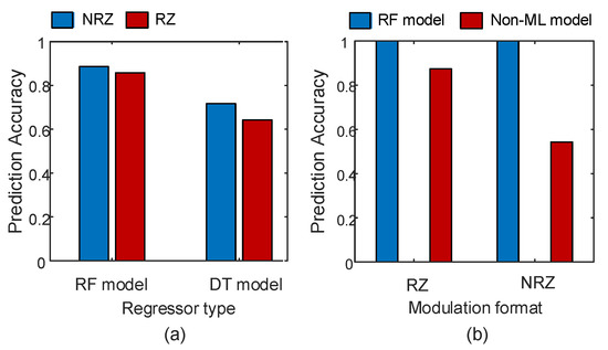 where and are the optical bandwidth of the photodiode and the electrical bandwidth of the receiver filter, respectively. Figure 7b shows the OSNR parameter prediction accuracy results of the RF ML proposed model and the non-ML model. For the RZ modulation format, the proposed model achieved 100% prediction accuracy while the non-ML model achieved 87% prediction accuracy. For the NRZ modulation format, the proposed model maintained the same prediction accuracy. However, the non-ML model’s prediction accuracy dropped to 54%. This reflects the power of using ML compared to non-ML models.