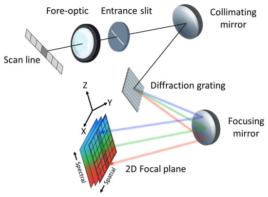 A simple design of a pushbroom HSI system can be seen in Figure 1, with the geometric projection of the slit being one-to-one with the detector pixel pitch in the spectral direction. Generally, a pushbroom HSI system only records spatial information in the cross-track direction, where each pixel is dispersed into a spectrum. The remaining spatial component must then be built up by the movement of the HSI system in the along-track direction. Thus, a 3D image of the scene is created, with each pixel containing a spectrum of the 2D spatial scene.