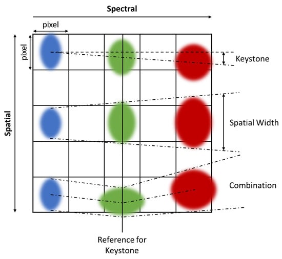 Figure 2 illustrates the main artifacts that contribute to spatial misregistration seen within HSI systems and include the following: keystone, SPSF width variability, and SPSF shape differences []. The top row shows a well-known distortion called keystone that describes the displacement of the SPSF’s centroid position as a function of wavelength and can be related back to a variation in the entrance slit magnification when focusing broadband illumination onto the focal plane. The middle row shows a wavelength dependent SPSF width originating from optical diffraction, aberrations, and specifically for HSI systems, the entrance slit and grating diffraction. The last row shows the combination spatial artifacts related to both keystone and SPSF shape differences that are often seen in real HSI systems []. What is not shown in Figure 2 are the field-of-view (FOV) dependencies on the various parameters that define spatial misregistration. To fully quantify HSI spatial misregistration, all off-axis behavior is required to be measured as well. In the work presented, we will show that the HSI system under test has degraded performance at the edges of the FOV.