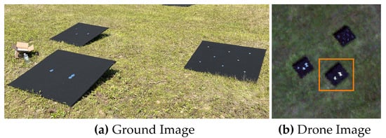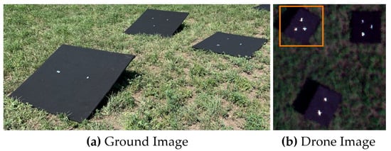 An example of a small area over the point targets that was oversampled by the drone motion. (a) Raw imagery with a small area that was oversampled highlighted in the orange box. (b) The ortho-rectified version with the orange box highlighting the same target area.