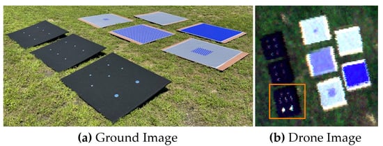 Figure 3 illustrates the field experiment that was conducted to estimate an MSI systems SPSF, utilizing our oversampling technique. Here, only the blue channel with a center wavelength of 475 nm with a bandwidth of 20 nm and an IFOV of 0.694 mrad was used to demonstrate the use of point targets. The drone was flown at an altitude of 57.6 m resulting in imagery collected at 4.0 cm GSD. In Figure 3, there were 16 similar point targets distributed over two black felt-covered panels (each 1.2 m × 1.2 m in size) with an edge target off to the side for comparison, which will not be discussed in this study.