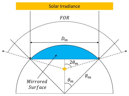 To assess spatial misregistration in drone-based HSI systems, the SPecular Array Radiometric Calibration (SPARC) method uses convex mirrors to rely on solar radiation to an imaging system for both radiometric calibration and spatial characterization [,,]. This paper will have a primary focus on using convex mirrors or point targets for spatial characterization. An initial radiometric assessment of point targets for drone-based HS imagery can be found in [,]. Spatially, the convex mirrors form a virtual image of the solar disk at the focal plane with a solar-like spectral signature creating a bright, sub-pixel point source. The reflected solar radiation has dependencies on the radius of curvature () or the focal length (), and the solar disk’s virtual image can be viewed from any angle within the Field-of-Regard () []. The projected area of the convex mirror () and define the . Mirror configurations used for all experiments can be found in Table 1. Simple geometric projections of the solar’s angular diameter through the convex mirrors can provide estimates of the solar disk’s physical diameter () as seen by an imaging system. Figure 7 illustrates the various geometric relationships for convex mirrors.