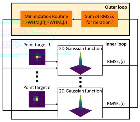 The double-loop algorithm estimates the x and y FWHM by minimizing the sum of the RMSE’s from all target responses. The inner loop estimates the targets center position with a fixed x and y FWHM and the outer loop optimizes the directional FWHM until a solution is found.