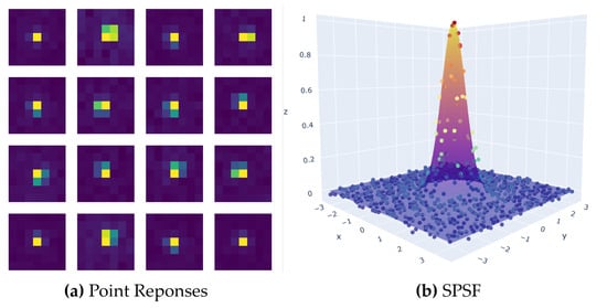 (a) The collection of phased point responses used in the creation of the SPSF. (b) Final SPSF result when using a 2D Gaussian distribution to centroid multiple point targets into a common reference frame.