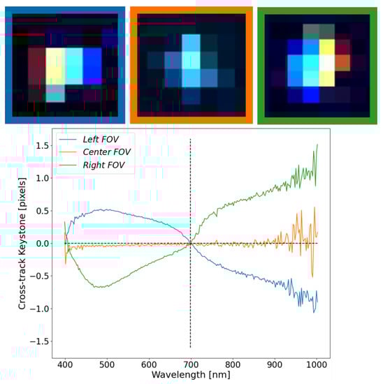 Quantifying spatial misregistration (Figure 14) provides a wealth of knowledge about the end-to-end performance of the HSI system by characterizing how well a point source is deposited onto the focal plane and is directly linked to the instrument’s spatial performance. These single metrics provide a user with a fast and simple calculation to assess how the HSI instrument focuses light originating from a sub-pixel point source. The small image chips in Figure 14 show the false-colored image (B-500, G-700, and R-900 nm) for visually understanding why the right FOV is worse than the center FOV. The overall color separation is indicative of misregistration, and the neighboring spatial pixels are corrupted more at the right FOV than at the center FOV.