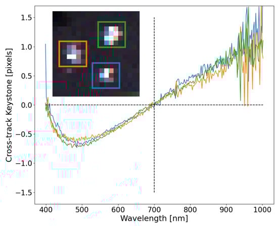 Using this fitting routine, the information depicted in the third row of Figure 2 can be dissected into two important parameters defined in the previous two rows. Keystone can be estimated by analyzing the center position in thee cross-track direction as a function of wavelength. When HSI systems image point targets, all wavelengths are measured simultaneously, where displacements in the point target’s centroid position can be measured relative to a reference wavelength. In this analysis, all centroid positions are measured relative to the position at wavelength 700 nm because this is the midpoint of the spectral range. Since all point targets are represented by rows and columns with the origin at the top left (i.e., coordinate (0,0)), a positive displacement means the point target was displaced to the right, and a negative value means the point target was displaced to the left.