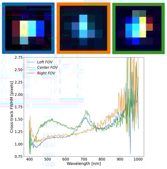 When the off-axis point targets are estimated, interesting features can be seen throughout the curves, with similarities and differences between each other. Both off-axis SPSF’s have an interesting increase in FWHM around 700 nm, but deviate from each other below 650 nm. The one inconsistency seen throughout all SPSF is within the left FOV FWHM estimate, which dips below 1 pixel. This is physically impossible due to the limiting blur factor of the pixel size (i.e., FWHM cannot be less than 1 pixel) and can be attributed to ortho-rectification errors and an unrealistic reconstruction of the instrument SPSF. This will be further discussed in Section 3.5.
