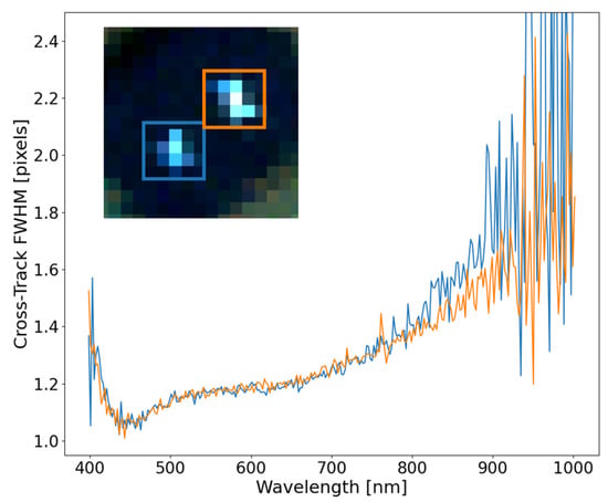 The assessment of the FWHM in the cross-track direction as a function of wavelength can highlight the unique behavior of spatial performance and impact scientific applications such as the spectral unmixing of sub-pixel targets. Figure 13 shows the consistency of the cross-track FWHM for two point targets in close proximity with good ortho-rectification. It is important to note that the point target in the orange box is a 2-mirror array aligned in the along-track direction. This has the potential of blurring the along-track FWHM but is still considered a sub-pixel target in the cross-track direction. This result demonstrates the consistency of the SPSF over a small localized region on the focal plane that can be extracted from this technique. These curves trend together between 400 and 800 nm, then slightly deviate after 800 nm due to errors in the fitting procedure and a lack of contrast between the background/target signals.