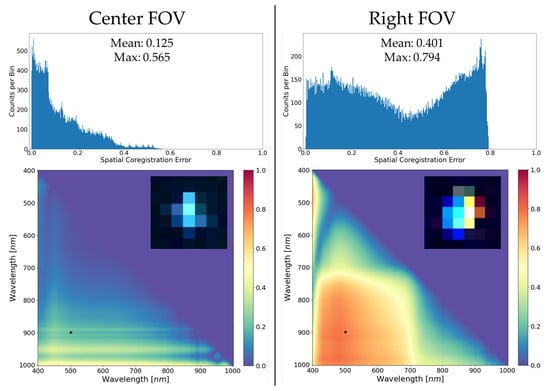 Examples of spatial coregistration error and how off-axis effects greatly degrade the image resolution and separability of targets from background in the area surrounding the SPSF’s. The histograms summarize the range and spread of the spatial coregistration errors with mean and max values. The heat maps at the bottom are a visual representation of spatial coregistration error for all wavelength pairs and is mirrored about the axis (i.e., wavelength pair (400, 401 nm) is equivalent to (401, 400 nm)). Black dots within the heat maps represent a specific wavelength pair to be discussed.