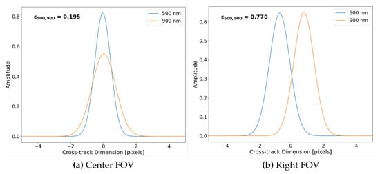 To further highlight features within the spatial coregistration error example (i.e., Figure 14), example plots of Gaussian distributions used in the error calculation (Equation (1)) for wavelength pair (500, 900 nm) are seen in Figure 15. For the reason the Center FOV example contains differing spatial misregistration than the Right FOV example, Figure 15 also highlights why large spatial coregistration error is experienced at the edge of the focal plane.