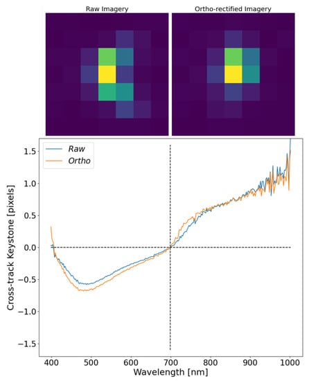 The top of the graph shows images of the same SPSF (raw and ortho-rectified) displayed at a single wavelength of 550 nm. The results from estimating keystone with respect to 700 nm show how minimal impacts from ortho-rectification affect the displacement of the SPSF as a function of wavelength.