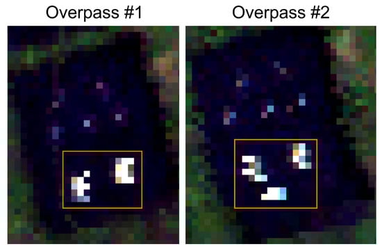 Inconsistent ortho-rectification over the same point targets from two different flight lines. The orange boxes highlight the targets of interest and only two mirrors were present, but Overpass #2 falsely contains three. Reprinted/Adapted with permission from Ref. []. © 2022 IEEE.