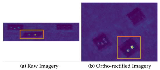 Oversampling the image scene presents the other end of motion-induced artifacts. This issue is not as damaging to the underlying physics because there is an excess of information or duplication that requires reduction. The problem with too much information is that the ortho-rectification process has to deal with reducing the imagery without over-fitting. Figure 19 shows an example of when point targets are oversampled and is highlighted by the orange boxes. The small point targets begin to resemble line sources in the raw imagery because the change in pitch/roll angle synchronizes with the forward motion of the drone. Furthermore, the point targets in the raw imagery highlight how a sub-pixel target would be reconstructed in the ortho-rectified image. Thus, the method provides for quality checks over targets of interest.