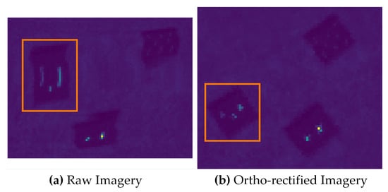 A comparison between raw and ortho-rectified imagery for a scene that was undersampled due to the motion of the drone and fix mounted setup of the HSI system. (a) Raw imagery showing the undersampled area in the orange box. (b) The resulting ortho-rectified image of the same area.