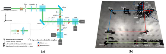 Our system based on the Mach–Zehnder interferometer is illustrated in Figure 1. The light source is a diode pumped solid state laser (Edmund, a maximum output power of 10 mW @ = 532 nm). After being filtered and expanded, a coherent beam emerging from the source is incident on a 50/50 non-polarizing beamsplitter cube. The coherent beam is then split into object and reference paths. The reference wave continues to travel through a linear polarizer and a quarter-wave plate sequentially to produce circularly polarized light. The linear polarizer is oriented at 45 degrees relative to the and basis vectors of the system while the quarter-wave plate is oriented parallel with the basis vectors.