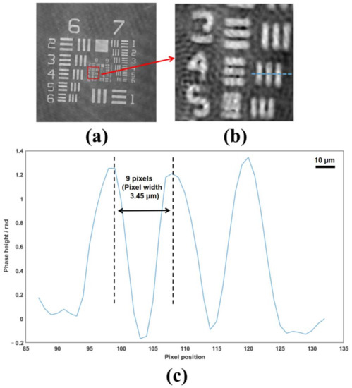 The phase-only USAF 1951 resolution chart was used for confirming the resolution of our system. The phase elements of the resolution chart were magnified by a microscope objective (Olympus PLN 10×, = 0.25, FL = 18 mm). An achromatic doublet (f = 250 mm, D = 50.8 mm) was used to collect the light output from the objective and transmits the clear image to the CCD (DAHENG, MER2-502-79U3CL, 2448 × 2048 @ 79 fps). The pixel pitch of each CCD used by the system is 3.45 µm and the holograms were recorded for reconstructing the phase on the basis of the workflow shown in Figure 2. According to the numerical aperture of the system and the wavelength of the coherent light source []: