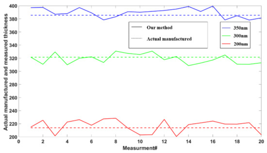 We used the phase-only USAF 1951 resolution chart as a static phase object to reconstruct its phase and corresponding thickness. The various elements of the resolution chart are etched onto the surface of the glass substrate, with a refractive index of 1.52 for both the substrate and the elements. When light passes through the resolution chart, the substrate and elements introduce different phase delays into the optical field. By evaluating the phase difference between the square elements (dashed red squares) and the substrate (dashed green rectangle), the height difference between the elements of the resolution chart and the substrate can be calculated. We first measured the phases of the 200 nm to 350 nm elements on the resolution chart. The reconstructed phases of 200 nm, 300 nm, and 350 nm using our system were presented in Figure 4. In order to observe the reconstruction results more intuitively, their three-dimensional (3D) maps were also shown in Figure 4d–f. As can be seen from Figure 4a–f, the proposed system successfully reconstructed the phases of the 200 nm to 350 nm elements on the resolution chart. According to the known refractive index, we could calculate the thickness distribution of the resolution chart. However, due to the errors in the manufacturing process, the actual manufactured thicknesses have some unavoidable differences. In order to make the calculation results more convincing, the thickness for each chart was estimated 20 times and plotted in Figure 5. Moreover, the average values of the thicknesses were taken as the results of measurement to compare with the actual manufactured thicknesses of the resolution chart in Table 1. As indicated in Table 1, the maximum difference of the thickness between the proposed method and actual manufactured thickness was 4 nm while the minimum difference of the thickness was just 2.6 nm. The above experimental results indicated that the proposed system has a good performance in reconstructing the phase and thickness of a static phase object.