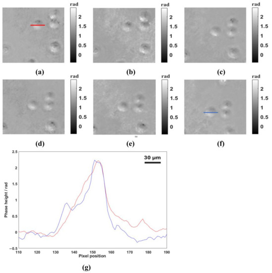 To verify the ability to reconstruct dynamic objects of our system, four imaging cameras were used to record a standard object at approximately 30 frames per second. As a standard object, its attribute parameters are strictly consistent with the manufacturer’s specifications, with an error of no more than 5%, and it has a high degree of recognition among peers. So, we chose the PMMA pellets (refractive index of 1.49) with a diameter of 10 µm as the standard object. We added PMMA pellets to mirror oil (refractive index of 1.51) and used the aforementioned microscopic objective and lens to image. Because PMMA pellets were placed vertically, they will move downward under the influence of gravity. The photography and the recording schematic were displayed in Figure 6. Figure 6a–e are phase images reconstructed from holograms recorded by the four cameras. In this study, the minimum norm methods [] were used to obtain the unwrapped phase image. From Figure 6a–e, we can clearly see the movement state of PMMA pellets from top to bottom, which demonstrated the feasibility of the proposed system to reconstruct the phase distribution of moving objects. The phase distribution of the red line and blue line indicated in Figure 6a,f are presented in Figure 6g. As shown in Figure 6g, the values of the highest points of the red line and the blue line were 2.33 rad and 2.35 rad respectively, and the corresponding thicknesses were 9.87 µm and 9.95 µm respectively. In addition, we also calculated the thickness of the all intact PMMA pellets in Figure 6a–e, and the average thickness is 10.12 µm. In order to make the measured results reliable, we reacquired 20 holographic images of the PMMA pellets and selected six images from the 20 holographic images as the measurement objects. All of the six images contained the PMMA pellets with the clearest phase and boundary. The phase images and corresponding measurement results were shown in Figure 7 and Table 2, respectively. To facilitate the statistical measurement of the results, brown rectangular boxes and numbers were added to each PMMA pellet measurement object in Figure 7 for the purpose of distinguishing different PMMA pellets. As shown in Table 2, the measured average thickness of PMMA pellets was 10.14 µm, which differed from the average diameter of PMMA pellets (10.17 µm) by only 0.03 µm. It should be noted that all PMMA pellets cannot strictly guarantee a uniform diameter of 10 µm and defocus existing in the process of dynamic recording may also cause the measuring errors. These experimental data indicated the accuracy of the proposed system.