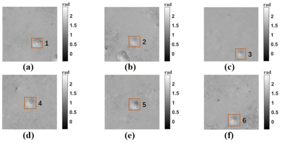 Dynamic phase image of the new PMMA pellets. (a–f) are the phase maps reconstructed of the new PMMA pellets.
