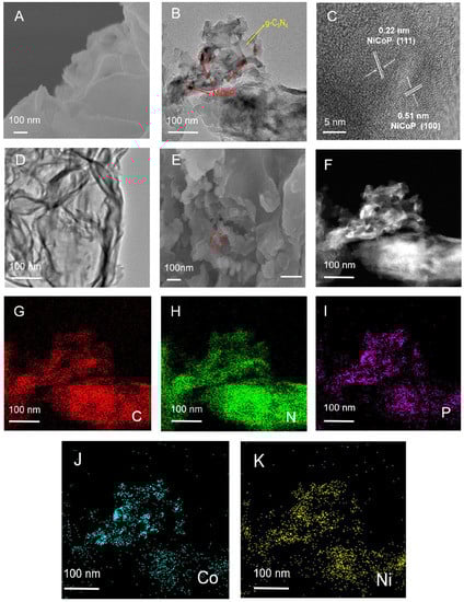The morphologies of g-C3N4 and NiCoP/g-C3N4 nanocomposites were investigated by SEM and TEM. For the g-C3N4, they appeared layered, rippled and resembled waves of crumpled silk veil, illustrating the nanosheets structure (Figure 1A,D). Our previous research identified that this special nanosheet structure could provide more active binding sites []. For the NiCoP/g-C3N4 nanocomposites, there were several small nanoparticles displayed on the g-C3N4 surface, implying that NiCoP was successfully loaded onto the g-C3N4 surface (Figure 1B,E). The HRTEM image shows distinct lattice fringes with a plane spacing of 0.22 nm and 0.51nm, corresponding to the (111) and (100) planes of NiCoP (Figure 1C) [,,]. In addition, the energy-dispersive X-ray spectroscopy (EDX) mapping image obtained in STEM mode demonstrated the C and N elements distributed in the substrate, and the Ni, Co and P elements throughout the structure (Figure 1F–K), further confirming the presence of NiCoP nanoparticles.